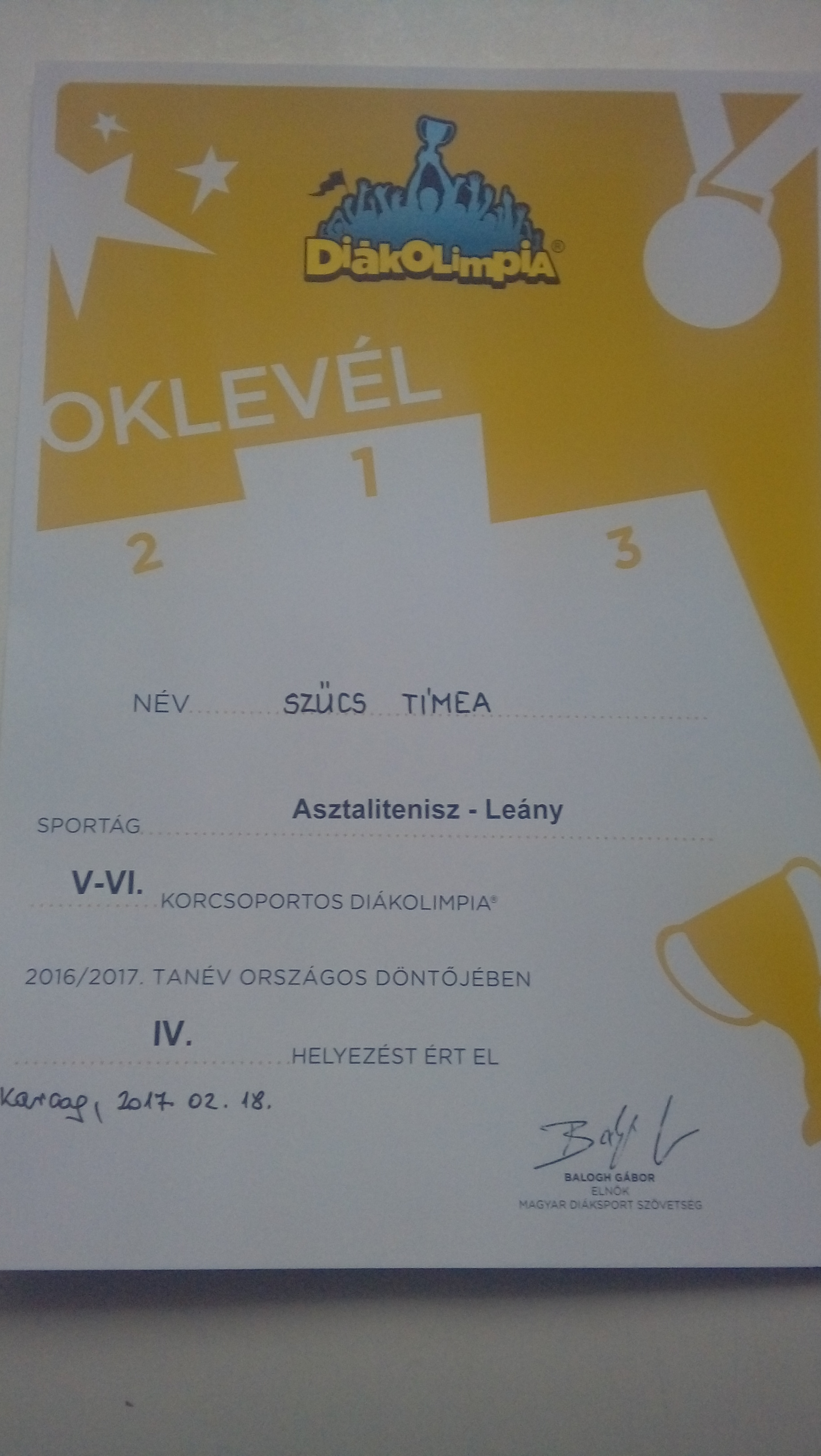 Szűcs Tímea a Karcagon megrendezésre kerülő Asztalitenisz leány V-VI. korcsoportos 2016/17-es tanév országos döntőjében 4. helyezést ért el.